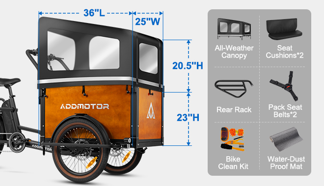 The Addmotor E‑325 electric cargo bike is engineered around a front‑loading cargo module designed for stability, versatility, and real‑world utility across family and commercial scenarios. The cargo box measures 36" × 25" × 23", providing a low‑center‑of‑gravity platform that enhances handling while maximizing usable volume for children, pets, groceries, or delivery payloads. Its reinforced structure and weather‑resistant materials ensure durability under daily use, while integrated mounting points support modular accessories such as child seats, tie‑downs, and cargo organizers.